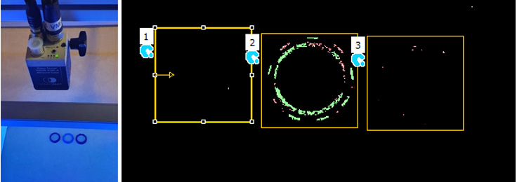 Imagen de la cámara Sensopart junto con luminaria ultravioleta Lumher y resultado de binarización por color