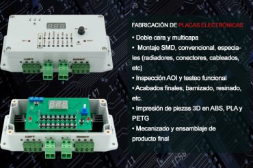 Damos soluciones de industrialización de proyectos de ingeniería electrónica, desde fabricación únicamente de placa electrónica hasta fabricación completa del equipo, aportamos soluciones eficientes de envolvente, montaje y testeo funcional. Garantía y calidad en el servicio post-venta. Dedícate solo a diseñar, que nosotros lo fabricamos.
