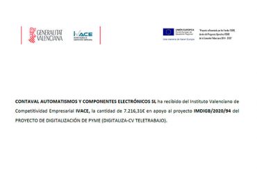 ContinuarCONTAVAL AUTOMATISMOS Y COMPONENTES ELECTRÓNICOS SL ha recibido del Instituto Valenciano de Competitividad Empresarial IVACE apoyo al proyecto IMDIGB/2020/94 del PROYECTO DE DIGITALIZACIÓN DE PYME (DIGITALIZA-CV TELETRABAJO).