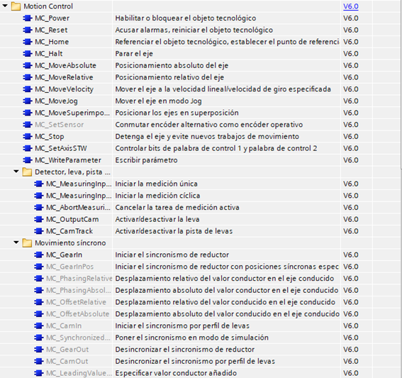Aquí podéis ver la configuración del objeto para un S7-1500 y los distintos tipos de movimientos que nos permite realizar:
