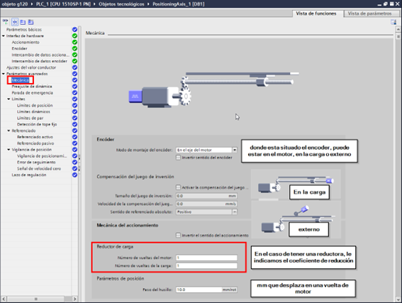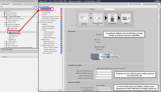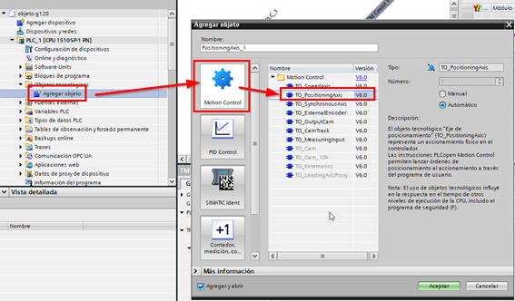 Aquí podéis ver la configuración del objeto para un S7-1500 y los distintos tipos de movimientos que nos permite realizar: