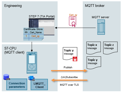 La librería «LMQTT_Client» ofrece un bloque de función para las CPUs S7-1500 y S7-1200. El bloque de función «LMQTT_Client» integra la función cliente MQTT y permite transmitir mensajes MQTT a un broker (papel de editor) y crear abonos (papel de subscriptor). En este caso, la comunicación se puede securizar a través de una conexión TLS. De esta manera se puede acceder al MQTT broker a través de una dirección IP estática o un nombre de dominio.