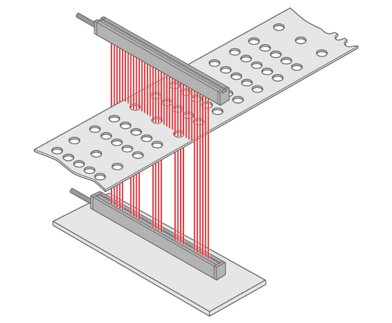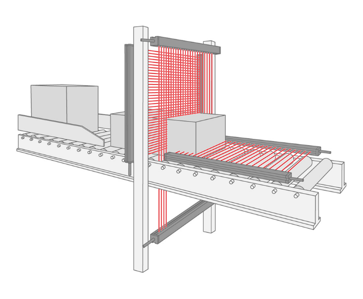 1La función blanking de algunas cortinas fotoeléctricas permite cegar la zona definida de la reja fotoeléctrica. En este caso, el campo de protección se puentea solo de forma parcial pero permanente. Para ello se desactiva exactamente la sección por la que ha de transportarse un producto.