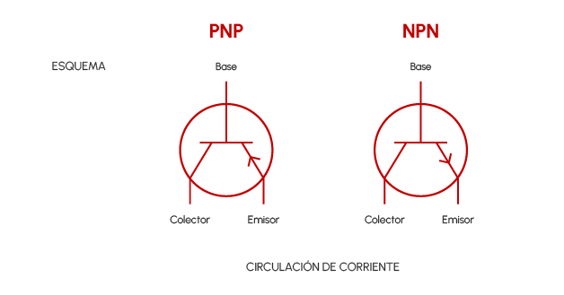 - PNP: La corriente de salida circula desde el emisor al colector (Emisor -> colector)