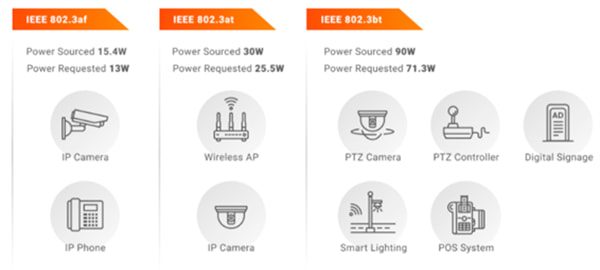 Junto con la evolución del IIoT (Industrial Internet of Things), los requisitos de potencia del PD no paran de aumentar. Por ello, el estándar PoE se va actualizando junto con la necesidad de mayor rendimiento PoE. Ya existían el estándar IEEE 802.3af que puede suministrar 15,4W y el IEEE 802.3at que puede suministrar hasta 30W. Actualmente disponemos del último estándar IEEE 802.3bt que puede proporcionar hasta 90W, satisfaciendo las necesidades de las aplicaciones más exigentes.