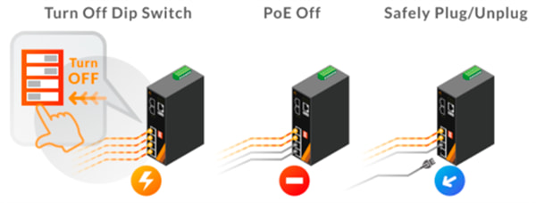 El PoE de alta potencia (802.3bt) tiene el riesgo de las chispas eléctricas. El diseño Safe PoE Disable permite a los usuarios conectar y desconectar los cables Ethernet de cobre de manera segura, asegurando el riesgo cero de chispa eléctrica y evitando posibles incendios.