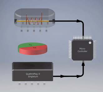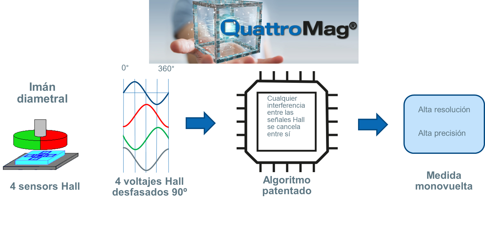 Esta tecnología se basa en 4 sensores Hall usados juntamente con un algoritmo patentado, que calcula el campo magnético generado por un imán dispuesto diametralmente de modo que cualquier interferencia entre las señales Hall se cancelan mutuamente. Esta tecnología, reservada antes exclusivamente al campo de los sistemas ópticos, está ahora disponible para aplicaciones dinámicas y de alta precisión.