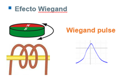 Un cable Wiegand consiste en un manguito magnético duro y en un núcleo magnético blando. La posición absoluta por vuelta (monovuelta) se mide con un imán en el eje rotativo y cuatro sensores Hall. Si el campo del imán se mueve a lo largo del cable Wiegand al rotar el eje, el campo magnético del núcleo blando es forzado a seguir al campo primero, obligado por el campo magnético del manguito magnético.