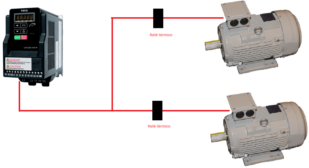 Por último, a la hora de seleccionar el variador adecuado debemos tener en cuenta el dimensionado del mismo, sin olvidar que éste debe ser capaz de dar la suma de corrientes de todos los motores. Además, es necesario incorporar un relé térmico adicional para la protección de cada motor como se muestra en la siguiente imagen: