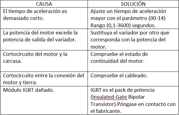 OC-A. Uno de los problemas más usuales en variadores es la sobrecorriente que se produce al acelerar. A continuación se exponen las causas que la provocan y el remedio más adecuado en cada uno de los casos.