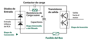 El equipo primero convierte la AC en DC mediante un puente rectificador de diodos; Este voltaje es filtrado por un grupo de condensadores con el fin de suavizar el voltaje rectificado y reducir la emisión de variaciones en la señal. Posteriormente observamos la etapa de inversión, la cual está compuesta por transistores IGBT (Insulated-Gate Bipolar Transistor), que conmutan en determinada secuencia para generar una forma de onda cuadrada de voltaje DC a una frecuencia constante. Su valor promedio tiene la forma de onda senoidal de la frecuencia que se aplica al motor.