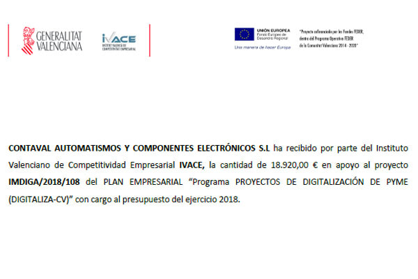 CONTAVAL AUTOMATISMOS Y COMPONENTES ELECTRÓNICOS S.L ha recibido por parte del Instituto Valenciano de Competitividad Empresarial IVACE, la cantidad de 18.920,00 € en apoyo al proyecto IMDIGA/2018/108 del PLAN EMPRESARIAL “Programa PROYECTOS DE DIGITALIZACIÓN DE PYME (DIGITALIZA-CV)” con cargo al presupuesto del ejercicio 2018.