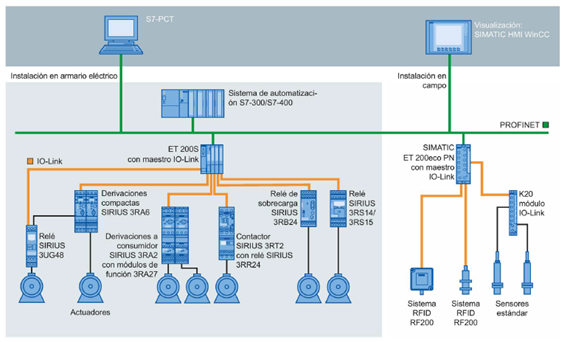 IO-Link permite la comunicación con los niveles de campo inferiores, empleando el cableado actual del sensor/actuador (conexión sencilla de 3 hilos, 2 de alimentación y 1 de señal), con independencia del bus de campo, lo que reduce el esfuerzo de cableado (transmite simultáneamente datos y alimentación).