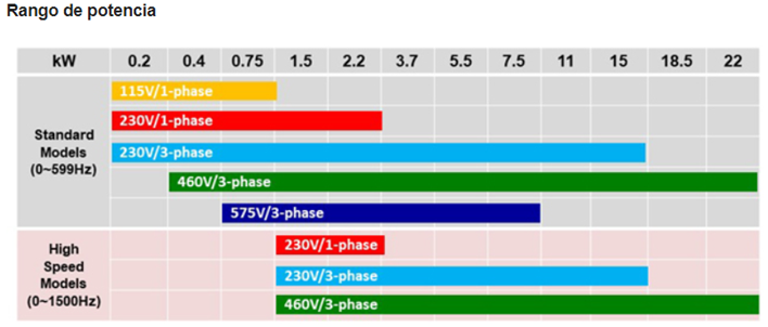 Por otro lado, el variador estándar permite la incorporación de tarjetas de comunicación como DeviceNet, PROFIBUS DP, CANopen, Modbus TCP, Ethernet/IP y EtherCAT además de Modbus RS485 de serie. Por otro lado, se puede programar el variador con un cable USB estándar tipo B, lo que permite una rápida y fácil puesta en marcha. El variador puede llevar incorporado un filtro EMC de baja corrientes de fuga, es capaz de soportar motores de inducción y de imanes permanentes (IM y PM) como por ejemplo servomotores en lazo abierto. Incluye la consola de programación extraíble con un sencillo potenciómetro, así como una pantalla display de 5 dígitos de altas prestaciones en el frontal del variador, para poder programarlo directamente sobre la pantalla. Por último, existen referencias especiales que permiten llegar hasta los 1500 Hz de frecuencia de salida del variador. En la siguiente imagen podemos ver el rango de potencias disponibles.